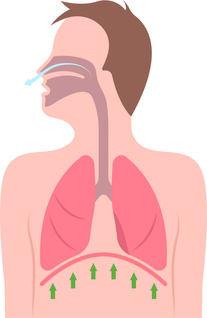 息を吸う時は横隔膜が収縮して下に下がることで肺を広げ、息を吐く時には肋骨の間にある肋間筋が教務を狭めることで肺が押し縮められ、体内の空気が押し出されます。